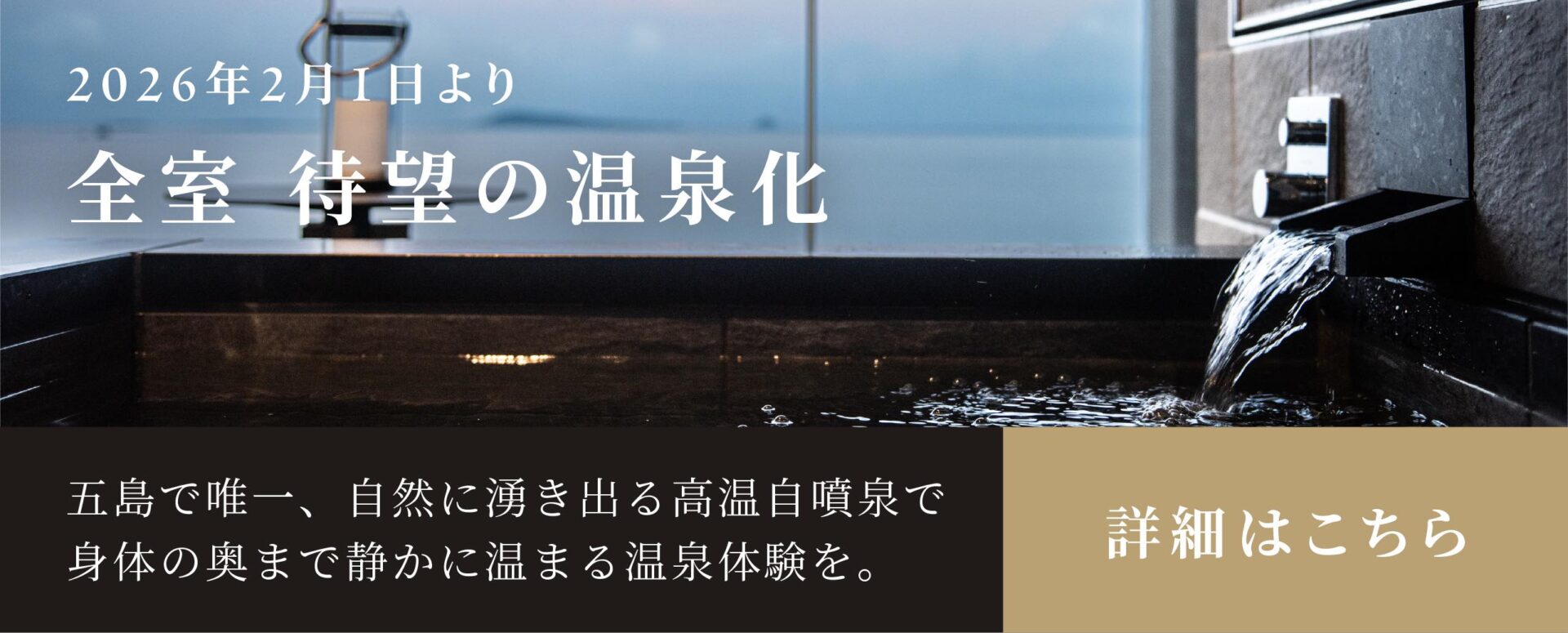 The only natural hot spring that gushes forth in the Goto Islands. Discovered in 1856 on the western coast of the island in Arakawa, these waters have been cherished by fishermen and passed down as the island’s treasure through time. Today, these waters are channeled to open-air baths overlooking the horizon, quietly weaving new stories.